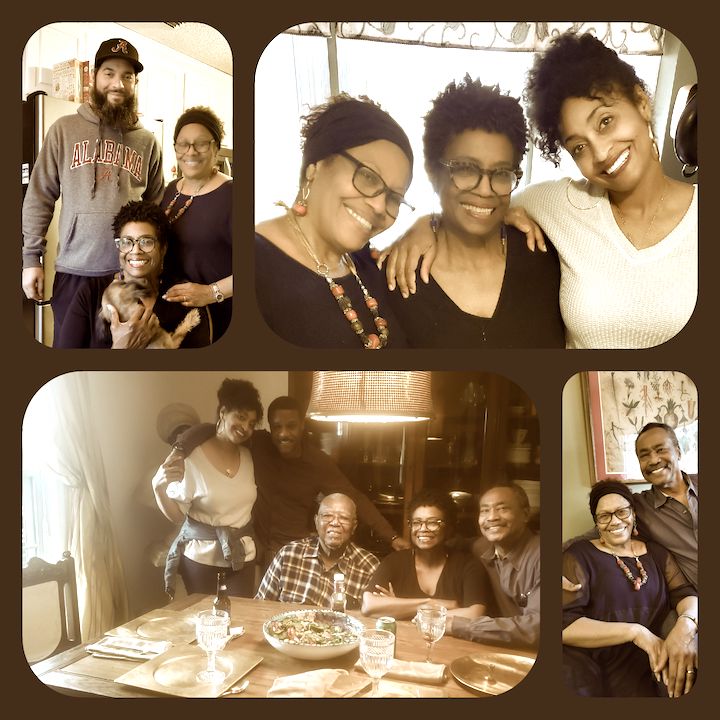 Photo clockwise: Miles, Pat, Bama, & Moi; Pat, Camille, and I; Pat & Thomas; Camille, Taurus, Holly, Thomas and Moi