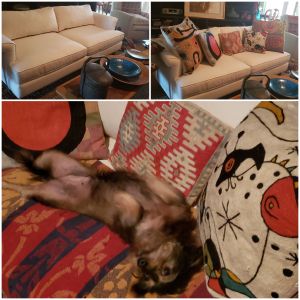 Top left: Couch, Top right: Couch with MY pillows, Bottom: Her Highness, Bama, with HER cover